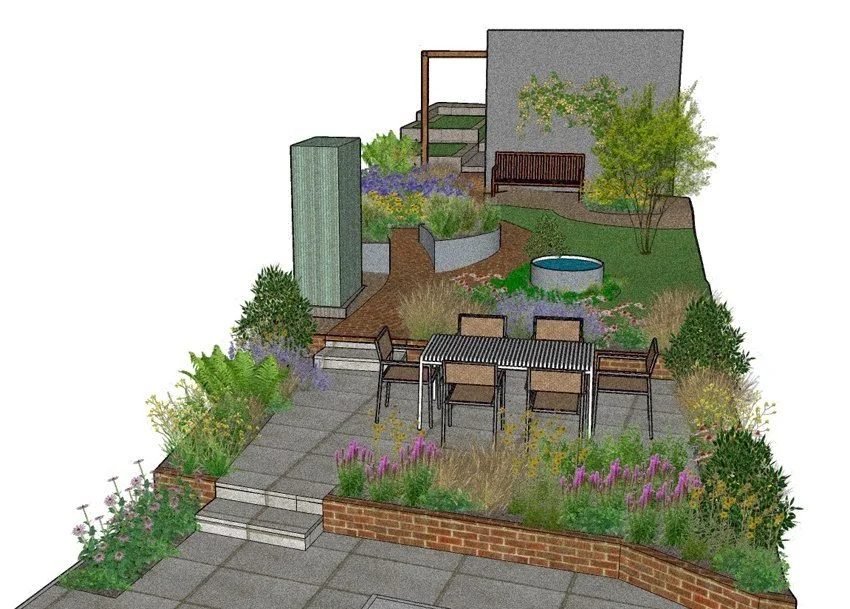 A town garden on a sloping site, the focus on this garden was to provide an additional space to relax and entertain that is nearer to the house. We have designed the garden to compliment the slope, with different areas of interest for the journey between the kitchen and the back gate. A wildlife friendly pond and a couple of practical raised beds made with galvanised steel provide feature points. the planting is designed with the gradient of the site in mind, giving plenty of colour and texture at different times of the year.